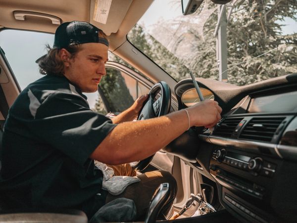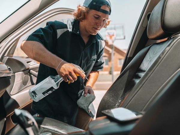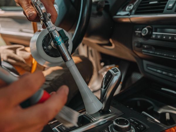 Each car is treated differently, but for the most part we use a combination of air, sensitive chemicals, soft and stiff brushes, and suction. The reason we use air is because it can clean places brushes can not. We us an assortment of brushes to do a couple things, like to agitate carpet for a deep clean, to gently remove anything in cupholders out, to clean leather without damaging it and more!